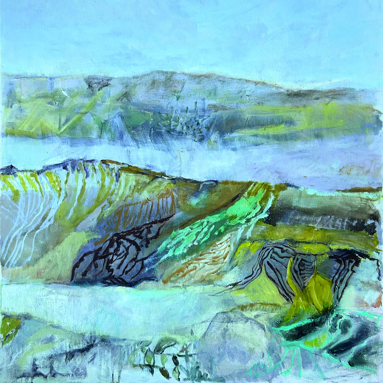 I Ingelise Holms malerier opstår landskaber, når felter og linjer mødes og brydes, hvorved bakker, marker, fjord og himmel dannes. Landskaberne bliver til i spændingsfeltet mellem mættede og umættede farvefelter i samspil med organiske streger, der ligger enten helt tæt, side om side, eller optræder som en blød konturstreg. Uldne kanter på mørkebrune og sorte farvefelter kan læses som køer placeret i landskaberne. Ingelise Holms malerier har en lethed over sig, som forstærkes af tomme felter, der spejler den ro, man ofte forbinder med landskaber.